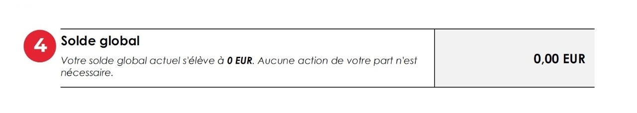 Alle von der CCSS erfassten und berücksichtigten Zahlungen, die vor der Erstellung des neuen Kontoauszugs getätigt wurden. Die vier jüngsten Zahlungen werden in absteigender Reihenfolge nach Wertstellungsdatum angezeigt. Falls mehr als vier Zahlungen erfolgt sind, werden diese in der letzten Zeile „Cumul paiements antérieurs (Kumulierte frühere Zahlungen)“ zusammengefasst. Die Summe der erfassten Zahlungen wird vom Gesamtbetrag abgezogen und dient der Berechnung des neuen Gesamtsaldos.