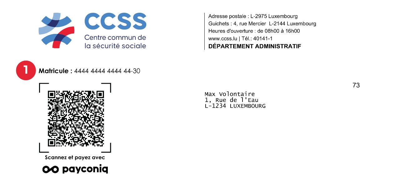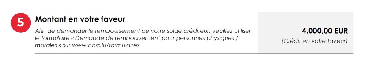 Alle von der CCSS erfassten und berücksichtigten Zahlungen, die vor der Erstellung des neuen Kontoauszugs getätigt wurden. Die vier jüngsten Zahlungen werden in absteigender Reihenfolge nach Wertstellungsdatum angezeigt. Falls mehr als vier Zahlungen erfolgt sind, werden diese in der letzten Zeile „Cumul paiements antérieurs (Kumulierte frühere Zahlungen)“ zusammengefasst. Die Summe der erfassten Zahlungen wird vom Gesamtbetrag abgezogen und dient der Berechnung des neuen Gesamtsaldos.
