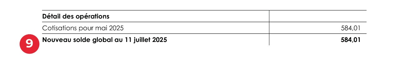 Der Gesamtbetrag des betreffenden Monats entspricht der Gesamtsumme, die der Versicherte bis zur Frist zahlen muss bzw. dem Betrag, den der Versicherte zur Rückerstattung beantragen kann. Der zu zahlende Gesamtbetrag entspricht dem „Nouveau solde global“ (Neuen Gesamtsaldo), der sich am unteren Ende der ersten Seite des Kontoauszugs befindet.