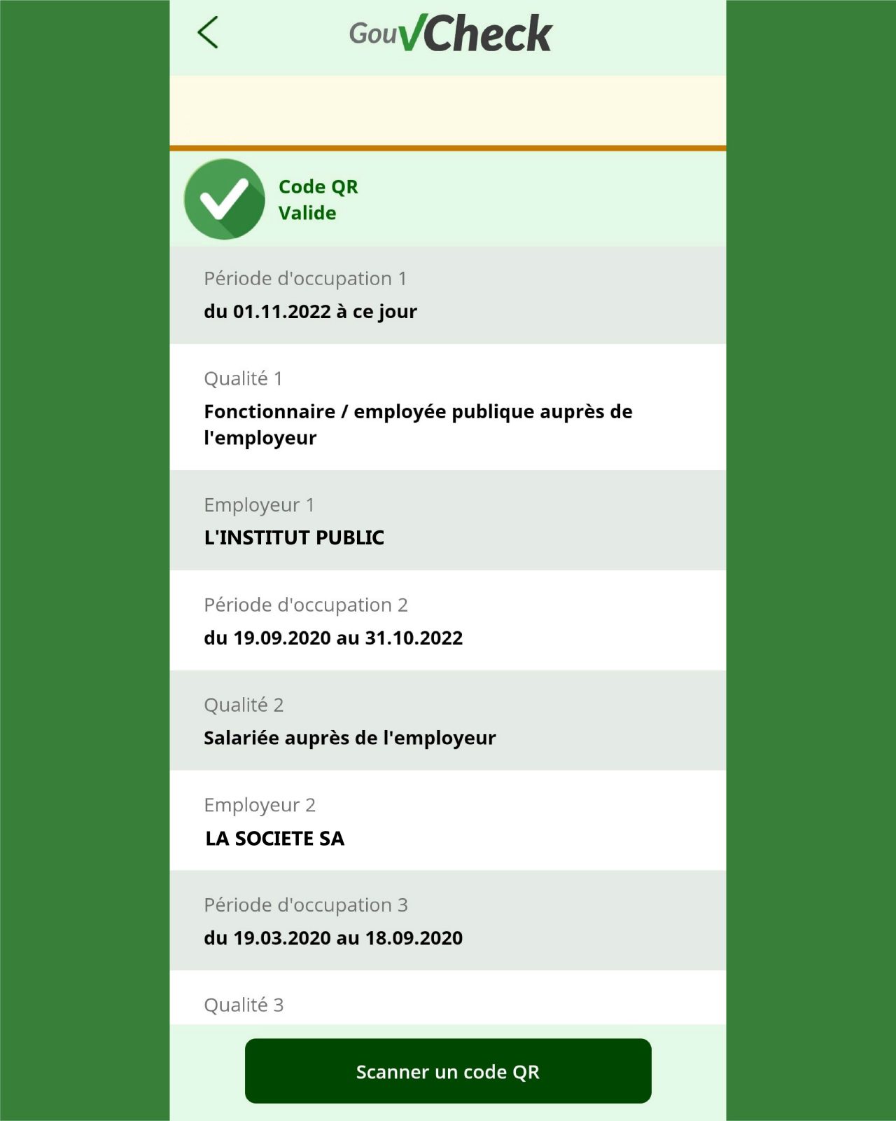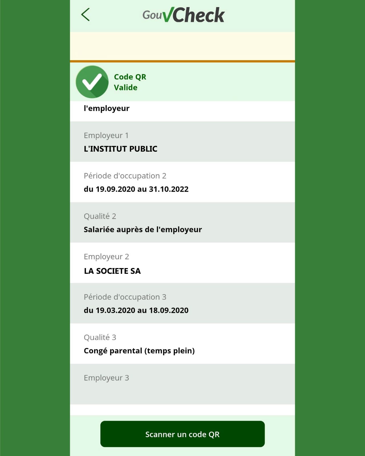 For example, if more than three affiliations are displayed on the affiliation certificate, only the last three affiliations will be included in the GouvCheck QR code. The same applies to wage statements covering more than three different periods: only the income for the last three periods will be displayed for each of the three income categories on the certificate.