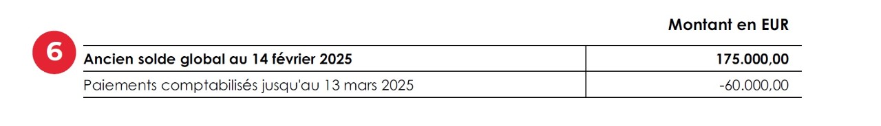 All payments recorded and taken into account by the CCSS before the issuance of the new account statement. The four most recent payments are displayed in descending order based on value date. If more than four payments have been made, these are grouped in the last line "Cumul paiements antérieurs" (Cumulative previous payments). The sum of recorded payments is deducted from the total amount due and helps calculate the new overall balance.
