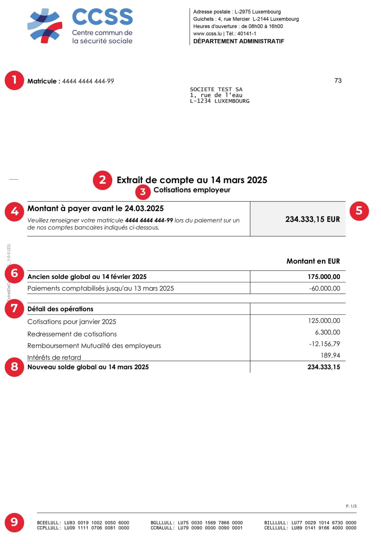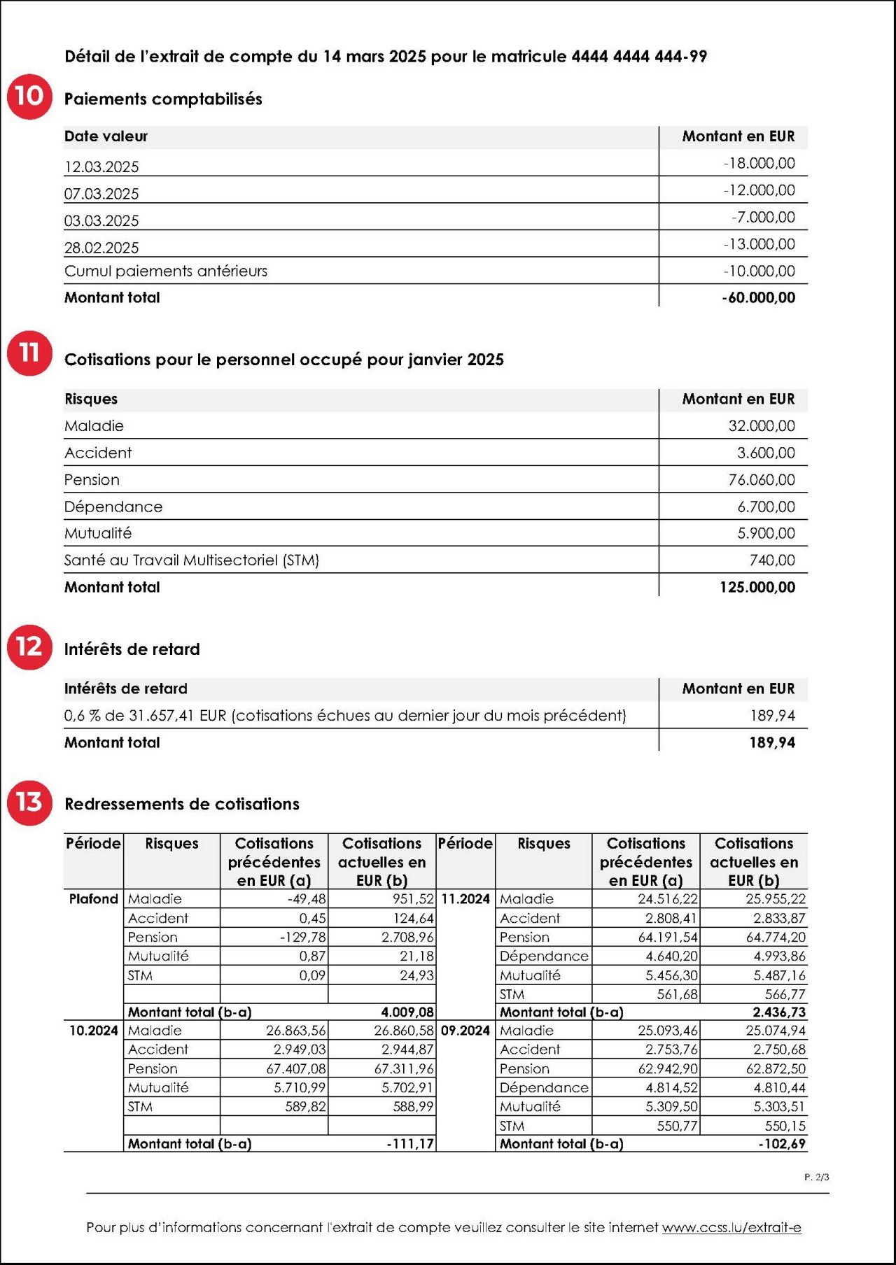 The employer must pay the balance indicated on the monthly CCSS account statement within 10 days of its issuance. Contributions not paid by the due date accrue late payment interest starting from the first day of the first month following the due date. The interest rate is set at 0.6% per full calendar month (article 428 of the social security law code (Code de la sécurité sociale, CSS)).
