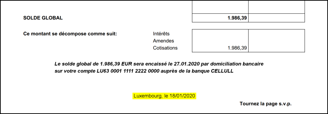 Lors de l’émission du décompte mensuel, le Centre commun de la sécurité sociale (CCSS) encaisse le montant dû figurant dans la rubrique « SOLDE GLOBAL » au plus tôt 7 jours après la date qui figure en bas de la première page du décompte :