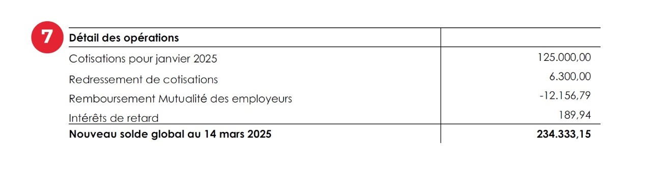 Le nouveau solde global correspond au montant total à payer pour le mois en question, après prise en compte des opérations récentes, comme les paiements, les cotisations calculées, les remboursements, les redressements, etc.