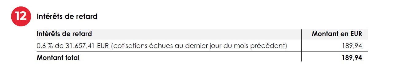 L’employeur doit régler le solde indiqué sur l’extrait de compte mensuel du CCSS dans les 10 jours à compter de la date d’émission de l’extrait de compte. Les cotisations non payées à l’échéance créent des intérêts moratoires qui commencent à courir le 1er jour du 1er mois qui suit l’échéance des cotisations. Le taux des intérêts moratoires est fixé à 0,6 % par mois entier de calendrier. (article 428 du Code de la sécurité sociale)
