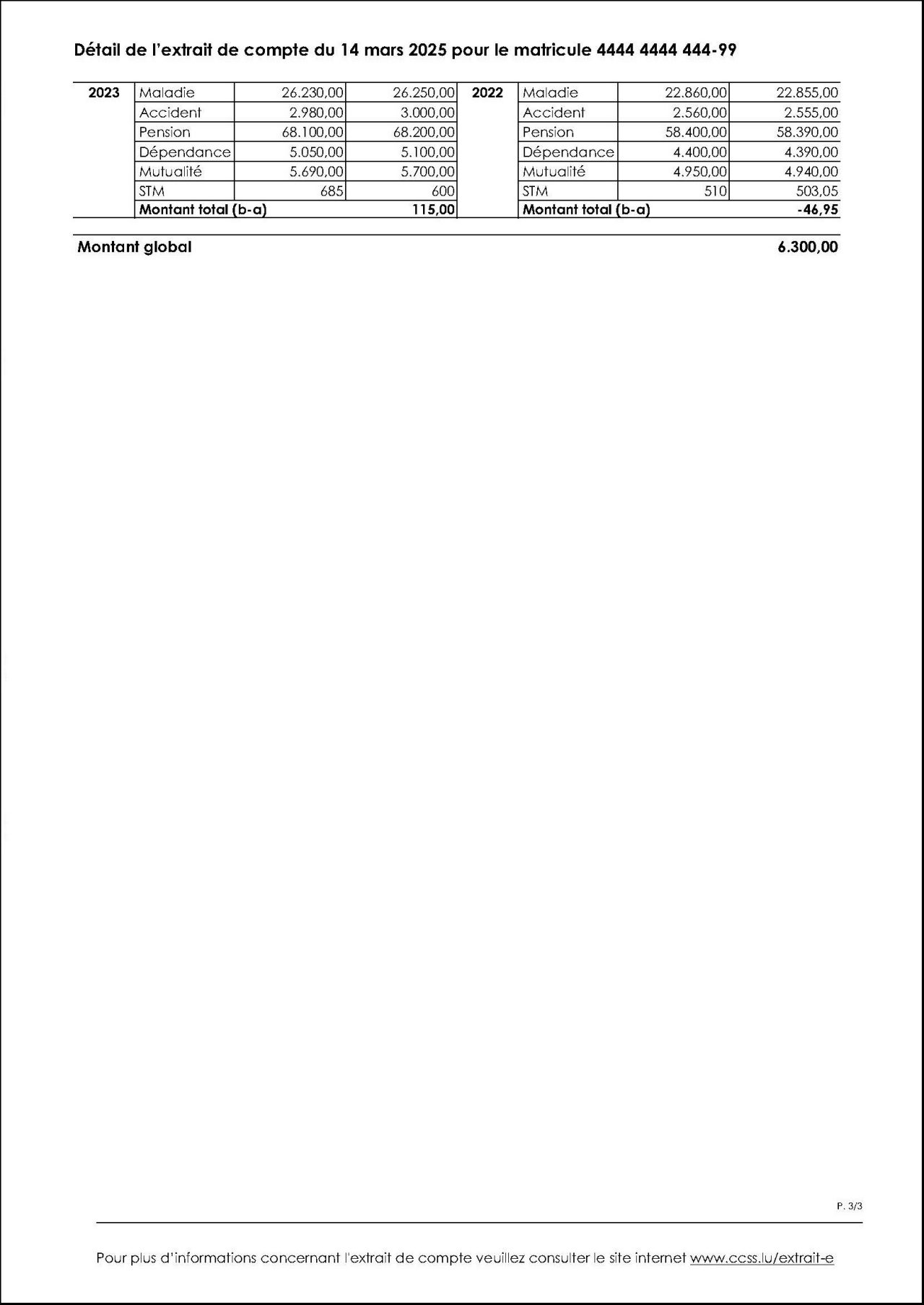 Le montant total du mois en question correspond à la somme totale que l’employeur doit régler avant la date limite de paiement, respectivement le montant que l’employeur peut demander en remboursement. Le montant total à payer correspond au « Nouveau solde global » qui se trouve en bas de la première page de l’extrait de compte.