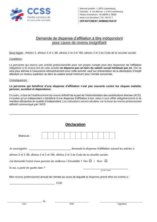 Demande de dispense d'affiliation à titre indépendant pour cause de revenu insignifiant